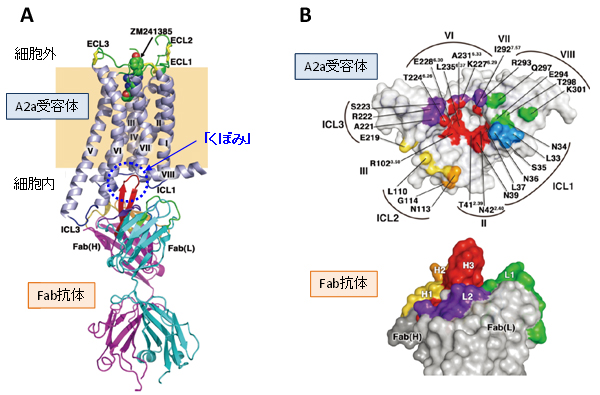 Fab抗体はアデノシンA2a受容体の細胞内側の表面を幅広く認識し、結合していました(図2A)。特に、抗体の超可変領域)の一つ(H3)は長く伸びたヘアピン構造を形成し、アデノシンA2a受容体の細胞膜を貫通しているらせん構造の部位から形成される「くぼみ」に深く突き刺さり、水素結合や疎水結合により強く相互作用していました(図2B)。
