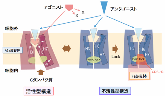 GPCRは活性化に伴い、らせん構造の一部が大きく動くことがすでに分かっています。従って、今回のアデノシンA2a受容体と抗体の複合体では、抗体の超可変領域(H3)がらせん構造の相対配置を固定するように結合しているために、アデノシンA2a受容体は活性型構造に変化することができず、これにより作動薬が結合できなくなっていると考えられます(図3)。以上の結果から、本抗体はアロステリック逆作動薬活性を持つ機能性抗体であることが明らかになりました。また、X線結晶構造解析による立体構造を得ることが難しいGPCRに対して、本研究で開発した抗体作製技術が有効であることを示すこともできました。