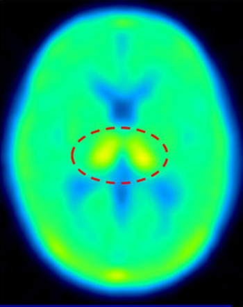 - 図1 脳内NATのPET画像。点線内の黄色い部分が視床