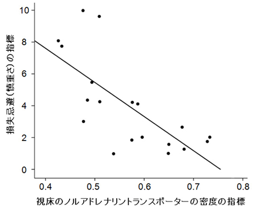 被験者の脳内のノルアドレナリントランスポーター(以下NAT)の密度をPET検査で調べた結果、視床のNATの密度が低い人ほど、より損失に比重を置いて判断する傾向があるという関係が見出されました。