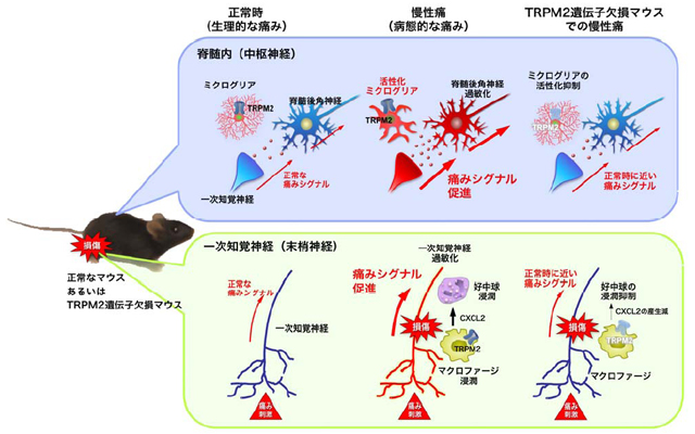 今回、私達は、好中球、マクロファージやミクログリアといった痛みの慢性化に関わる免疫系細胞に存在し、活性酸素種のセンサーとして機能しているイオンチャネルであるTRPM2(トリップエム2)の働きに注目し、TRPM2を遺伝子操作により欠損させたマウスを用いて、慢性痛、特に炎症性疼痛や神経障害性疼痛との関連を検討しました。
