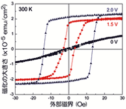 外部から磁界や電流を加えたり温度を変えたりすることなく、磁石の性質を室温で電気的に制御する手法は、将来的には、消費電力の極めて小さな磁気記録メディアへの応用や、コイルを用いない電圧駆動式の磁界発生器などへの応用が期待されます。また、電荷密度(=原子1個当たりの電子の数)を電圧で制御して、磁力をスイッチできるということは、材料科学の観点から、遷移金属の磁石が磁石であるための条件を考える上で大変有益な情報をもたらすと考えられます。