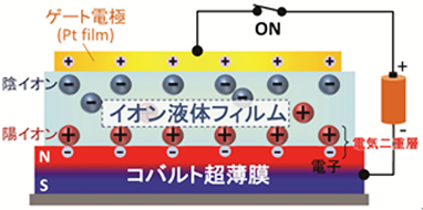 コバルト超薄膜、イオン液体を含んだポリマーフィルム(イオン液体フィルム)、ゲート電極によって構成されている。上下に電圧を印加すると、コバルト上にイオンが集まり、コバルト表面に電荷が誘起され、磁性を制御することができる。