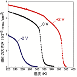 図2は磁化の大きさの外部磁界依存性です。電圧を0Vから+2Vと変化させるにつれ、磁化の大きさが大きくなり、磁石に特有な履歴特性(ヒステリシス)が顕著に増大しています。これは0 Vでは磁力を帯びていなかったコバルトが、+2Vで磁力を帯びた、つまり磁石の状態になったことを意味します。図3は僅かに特性が異なる同様の素子で行った磁化の大きさの温度依存性です。磁化がゼロになる温度が強磁性相転移温度です。±2Vの電圧で、100度程度、相転移温度が変化していることが分かります。つまり、この温度範囲では、コバルトの磁力を電圧でスイッチできることを意味します。このように、小さな電圧で巨大な変化を実現できたことは、電気二重層の大きなキャパシタンス(電荷を蓄積する能力)によるものであると考えられます。