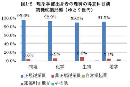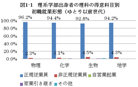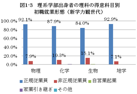- 理系学部出身者に関しては、物理を得意とする者が、化学や生物を得意とする者より初職においても大企業に正規従業員として就職する割合や、現職において役職者である比率が高く、所得も高かった。特に、すべての世代において、物理を得意としている者が相対的に低い非正規比率となっている点は注目される。最も若い世代では、物理と生物との非正規比率の差は7.2%まで開いている。