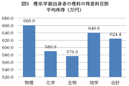 ※理系学部出身者のほうが文系学部出身者より平均所得が高い。 - 西村和雄・平田純一・八木匡・浦坂純子[2012]「高等学校における理科学習が就業に及ぼす影響-大卒就業者の所得データが示す証左-」『RIETI Discussion Paper Series 12-J-001』(独立行政法人産業経済研究所)pp.1-19.
