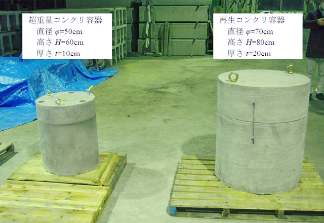 写真1 再生コンクリ容器と超重量コンクリ容器