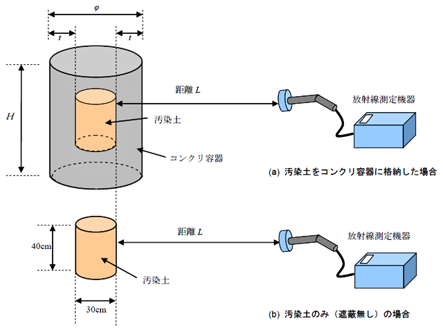 実証実験のセッティングの概要を図1に示す。汚染土を直径30cm高さ40cmの薄いプラスチック製容器に入れ、まず汚染土のみについて図1の要領で汚染土表面からの距離Lを変化させながら放射線量を計測した。次に、写真1に示す2種類のコンクリ容器内部に格納し、同様に距離Lを変化させて放射線量を測定し、遮蔽容器の遮蔽性能を評価した。