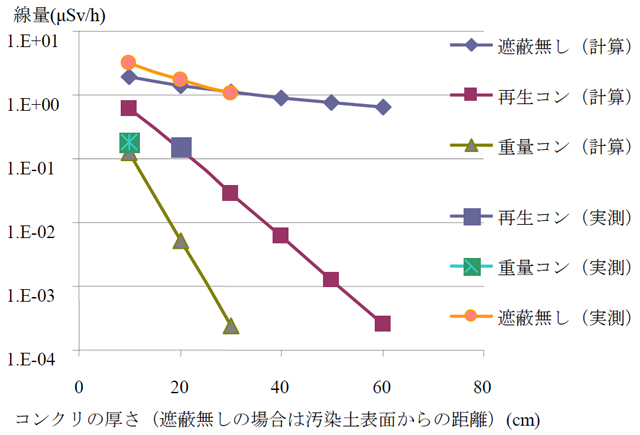 また、再生コンクリの厚さを10、30、40、50、60cm、超重量コンクリで20、30cmまで計算した結果も示す(側面方向および鉛直方向でそれぞれ汚染土表面からの距離)。この結果から、超重量コンクリは再生コンクリに比べて厚さが20cmの場合は27倍、30cmの場合は120倍の遮蔽能力があることが分かる。