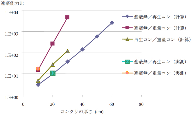 図3 コンクリの厚さと遮蔽能力比のプロット