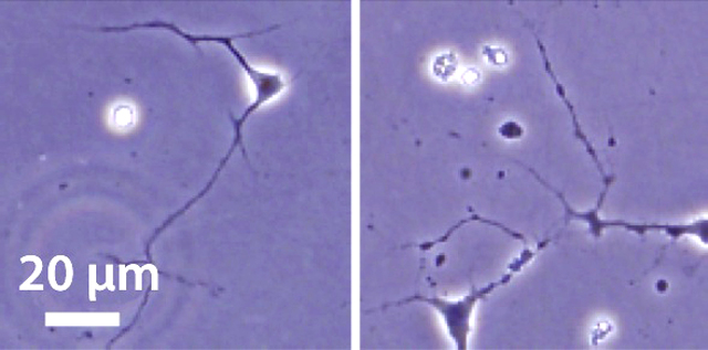 図1. 健常人型SOD1(左)と変異疾患型SOD1(右)を発現させた運動神経細胞の形態