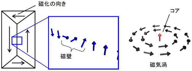 図1:磁区と磁壁と磁気渦の概念図。磁壁内部や磁気渦では磁化がねじれた構造をとっている。この領域の磁化が動くことでスピン起電力が発生する。磁気渦の中心で磁化が面直方法を向いているのがコアである。