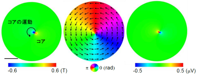 図2:(左)磁化の面直成分:赤い部分が面直方向に磁化が向いている領域を表しているため、ここがコアに相当する、(中)磁化の面内成分:面内磁化の向きが還流構造をとっており、磁気渦構造をとっていることが分かる、(右)コンピュータシミュレーションによって得られた、スピン起電力から発生する電圧の空間分布:コア付近にある赤い領域と青い領域が、それぞれ電圧の高い領域と低い領域に対応し、これらの間の電位差を測ることでスピン起電力を観測することができる。