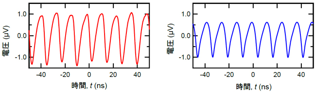 磁気渦構造は、交流磁場によって共鳴的にコアを円運動させることができます(図2)。我々はこの磁気渦構造の共鳴運動によって生じるスピン起電力の実時間観測を行いました。図3(左)はコア近傍に現れる交流電圧を示しており、およそ1マイクロボルト程度の電圧が周期的に検出されていることが分かります。この周期はコアの円運動の周期と一致しており、これはコアの円運動に付随した起電力、すなわちスピン起電力であることを示しています。コンピュータシミュレーション[6]を用いた計算結果(図3(右))と比較しても、実験結果と計算結果はよく一致していることが分かります。このように、我々は磁気渦構造のコアの運動から発生するスピン起電力のリアルタイム測定に成功しました。