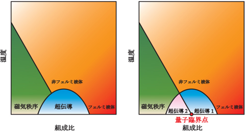 2008年に日本で発見された鉄イオンを含む新型高温超伝導体は、相転移の一種である反強磁性の相転移温度が絶対零度付近に制御された物質群で、高い転移温度を持ったドーム型の超伝導が出現することがわかっています(図1)。しかしながら、ドーム型の超伝導相ができることで、絶対零度の相転移点(量子臨界点)が消失してしまうのか(図1左)、超伝導内部で相転移点が存続しているのか(図1右)が大きな論争になっていました。