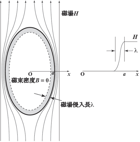 超伝導物質では、転移温度Tc以下の温度に冷却すると、電気抵抗がゼロになり電力消費なしに電流を流すことができ、それと同時に磁場を完全に遮蔽することができる性質(マイスナー効果)を示します。この磁場を遮蔽する能力は、「磁場侵入長」λとよばれる物理量で決定づけられます(図2)。磁場侵入長の長さ(通常数十~数百ナノメートル程度)は超伝導電子の密度と重さ(有効質量)と密接な関係があり、超伝導状態を記述する上で最も基本的かつ重要な量となっています。