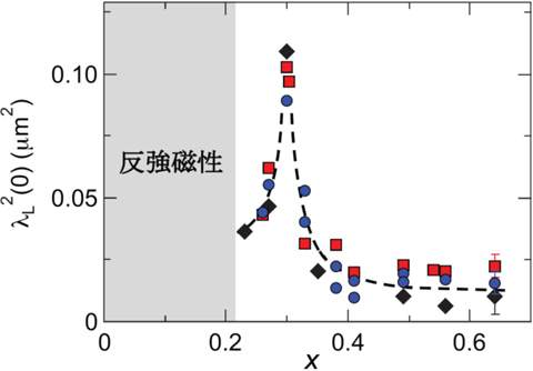 (BaFe2(As1-xPx)2の最適組成で観測された絶対零度における磁場侵入長の急峻なピーク構造)