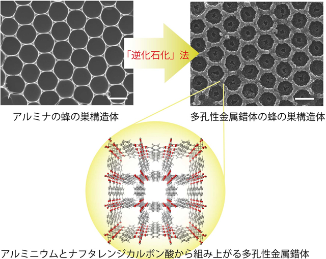 「逆化石化」法がPCPの合成に利用可能かを調べるため、図3左に示すようなアルミナの蜂の巣型構造体を作りました。この蜂の巣の孔一つは約1マイクロメートルです。この構造体を、ナフタレンジカルボン酸とよばれる酸性有機化合物の溶解した水溶液中に浸漬し120度で加熱したところ、図3右に示す様に蜂の巣型構造体を維持したまま直方体状の結晶の集合体に変換されました。X線回折測定などから、これはアルミニウムとナフタレンジカルボン酸からなるPCP(図3下)であることが明らかになりました。この様に、あらかじめアルミナの構造体を形成しておくことで、メゾスコピック領域においてもPCPの「形」を制御することが可能になりました。
