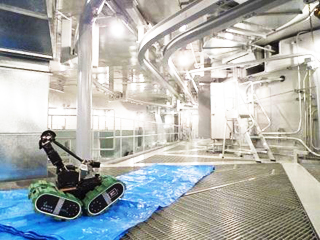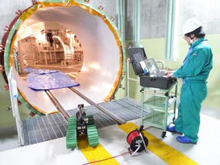 | 写真1 クローラ型ロボット「KOHGA3(こーが3)」を用いた原子炉格納容器内での無線操作の距離確認実験の様子 | |