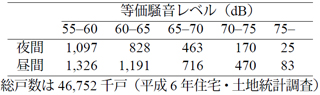 我が国全体での道路交通騒音の曝露人口として、表1に示した騒音曝露量別戸数の資料(4)を利用した。なお、この資料は、平成6年度道路交通センサスデータに基づいているため、対象道路が限定されており、55dB以下の曝露戸数の情報も含まれていない。睡眠妨害などはより低レベルから健康影響が生じるため、算定される健康損失(DALY)の値は控えめな値となる。