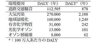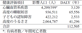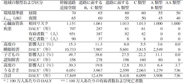 我が国の騒音の環境基準は、騒音種別や土地の利用目的によって基準値が異なる。「騒音に係わる環境基準」に関して、各環境基準値と等しい騒音曝露がある地域での100万人あたりのDALYを算定した。結果を表5に示す。