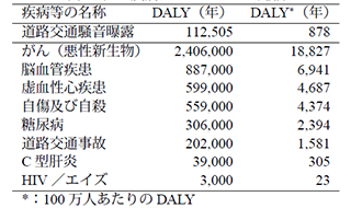 ![]() 表3: 他の疾病のDALY(2)との比較 | ![]() 表4: 各種環境要因のDALY(5)との比較 |