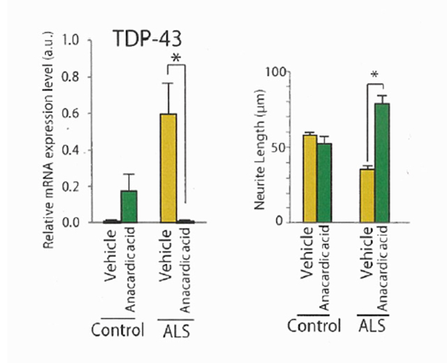 アナカルジン酸添加により、ALS運動ニューロンでTDP-43のmRNA量が減少し、神経突起の長さが伸びています。