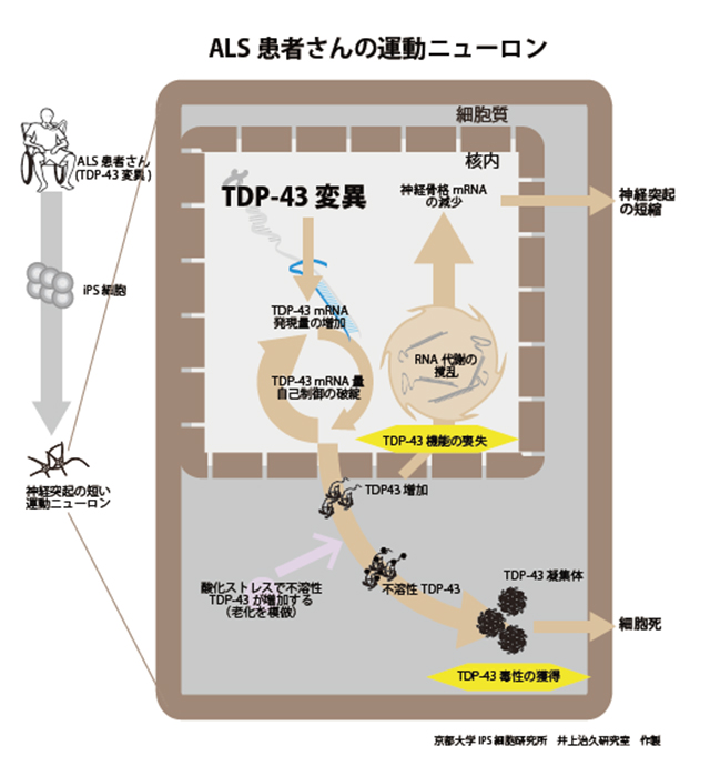 - ALS患者さんの細胞から樹立したヒトiPS細胞を用いて、ALS患者さんの病態を細胞レベルで再現するモデルを構築し、これまで知られていなかったALSの病態の一端を明らかにした。