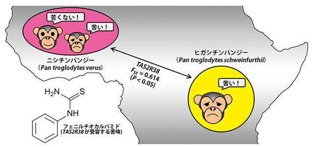 研究グループは、日本全国の動物園や研究施設に協力をいただいて、4種類のアフリカ地域に由来するチンパンジーについて、苦味感覚をもたらす原因遺伝子である苦味受容体遺伝子(TAS2R)の塩基配列の個体差を網羅的に決定しました。その結果、驚くべきことに、TAS2Rのおよそ3分の2の遺伝子型が、地域に特異なものであることが明らかになりました。また、そのような個体差が地域に出現する過程を解析したところ、地域によって異なる自然選択が生じていることが明らかになりました。この結果は、異なる食物環境適応による地域差が、チンパンジーの苦味感覚に生じていることを示しています。