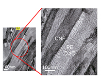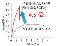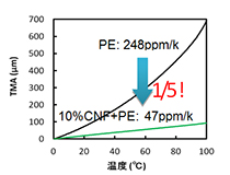 ![]() 図2:セルロースナノファイバー添加によるPE結晶の配向 | ![]() 図3:セルロースナノファイバー強化による材料強度の向上 | ![]() 図4:セルロースナノファイバー強化による線熱膨張の低減 |