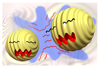 図1:プラズマ粒子は、ぶつからなくてもお互いにプラズマ波動を介してエネルギーを授受します。(イラスト: 熨斗千華子氏)