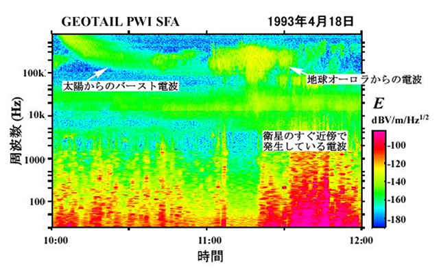 宇宙空間は、プラズマという電離気体で満たされています。通信衛星や気象衛星、国際宇宙ステーションも、この宇宙プラズマ中を飛翔しています。この宇宙プラズマ中では、それを構成している電子やイオンの動きによって電波が発生しています。宇宙プラズマ中の電子やイオンはお互いに衝突することなく、この電波を通じてエネルギーを交換しています(図1)。したがって、この電波(プラズマ波動と呼びます)を観測することで、宇宙空間で発生している現象を知ることができます。