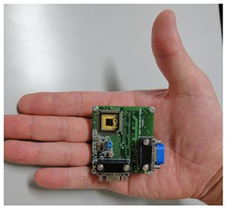 本学では、人工衛星に観測器を搭載してプラズマ波動を宇宙空間で観測する研究を、国内研究者の中心として日本の科学衛星黎明期から推進してきました(図2)。プラズマ波動観測器と呼ばれるその観測装置は、非常に感度の高い電波受信器であり、その大きさは面積でA4用紙サイズ(210mm×297mm)程度あります。本研究グループでは、このプラズマ波動観測器専用のアナログチップ(ASIC: Application Specific Integrated Circuit)を設計・開発し、プラズマ波動観測器をマッチ箱サイズ(45mm×50mm)にまで小型化することに成功しました(図3)。