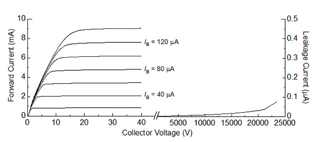ベース(Base)端子の電流(IB)によりコレクタ(Collector)端子の電流をオン/オフ制御することが可能(図左部分)。トランジスタがオフ状態を2万ボルト以上まで維持し、素子は破壊しない。