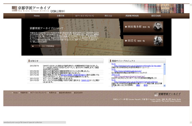 林 晋 文学研究科教授 (情報・史料学専修)、藤田正勝 同教授(日本哲学史専修)、出口康夫 同准教授(哲学専修)らの研究グループは、WEB上の画像アーカイブ、「京都学派アーカイブ」を2012年11月11日に正式公開しました(図1)。(URL http://www.kyoto-gakuha.info)