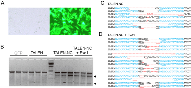 図2:(A)ラット線維芽細胞(Rat-1)とGFPを導入したRat-1細胞(B)Surveyor(Cel-1)ヌクレアーゼアッセイ法により確認された遺伝子変異、Exo1共発現により遺伝子変異導入率が上昇(C、D)シークエンス法により確認された遺伝子変異