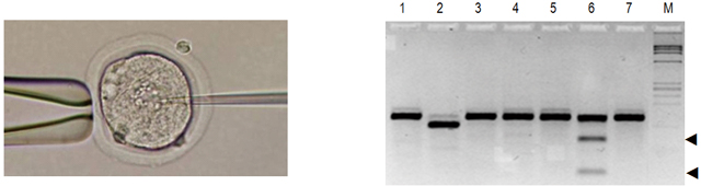 図3:ラット受精卵へマイクロインジェクション法によりTALENを導入(左)、Surveyorアッセイにより確認された遺伝子変異(右)
