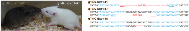4. TALENとExo1 mRNAをラット受精卵にインジェクションすることで、TALENを利用したTyr遺伝子ノックアウトラット(アルビノラット)を作製することに成功しました。
