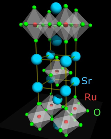図1: ルテニウム酸化物超伝導体Sr2RuO4の結晶構造。ルテニウム(Ru)と酸素(O)から成る平面構造が超伝導をはじめとする興味深い性質に主要な役割をしています。
