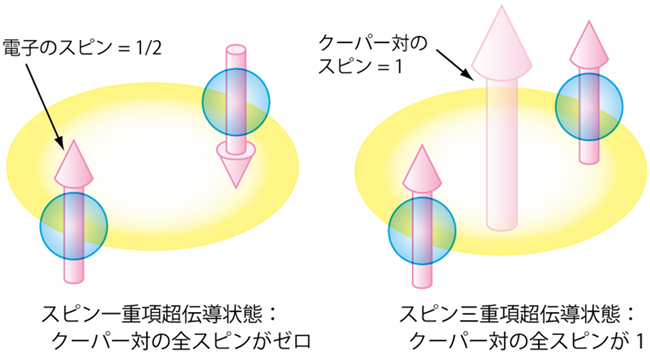 図2: スピン一重項超伝導状態(左)とスピン三重項超伝導状態(右)を比較した模式図。一つの電子は1/2の大きさのスピンをもっており、上向きと下向きの2種類の場合があり得ます。スピン一重項超伝導では上向きスピンと下向きのスピンをもつ電子が対を組むため、クーパー対の全スピンは打ち消しあってゼロとなり、スピンの自由度は失われてしまいます。一方、スピン三重項超伝導では同じ向きのスピンが対を組むため、対の全スピンは1となります。従って、スピンの自由度の残った超伝導状態という大変に興味深い状況が実現します。