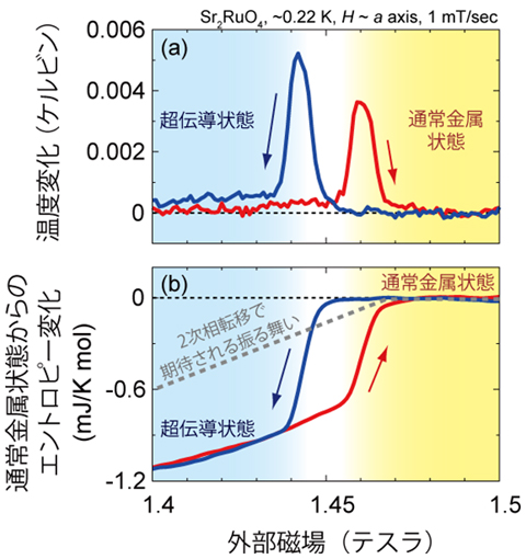 本研究では、本学で作製したSr2RuO4の純良結晶を用い、磁場を変化させたときに試料の温度が変化する「磁気熱量効果」を詳しく調べることで、相転移が一次相転移になっていることを実証しました。具体的には図3に示すように、一次相転移の特徴であるエントロピーという量の不連続的な変化と潜熱が観測できました。さらに、磁場を上昇させたときと下降させたときでの超伝導転移の起こる磁場が異なっており、これは一次相転移の特徴である過冷却現象(または過熱現象)が起こっていることを証明しています。
