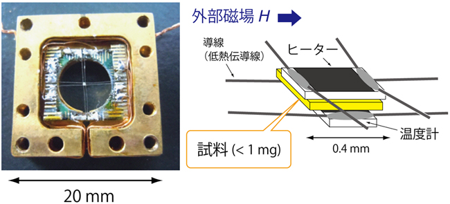 図4: 本研究のために開発した自作の高感度磁気熱量効果測定装置(左)と装置中央部の温度計部分の模式図(右)。温度計とヒーターが低熱伝導線で空中に吊るされており、試料は温度計とヒーターで挟むようにして設置します。非常に小型の温度計とヒーターを用いることで、1ミリグラム以下の微小試料の測定が可能になりました。