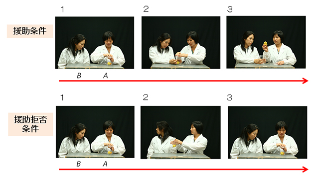 作業夢中条件:(1)AもBも容器を開けようとする。(2)AがBに援助を求めるが、Bは自分の作業に夢中で援助しない。(3)A、Bともに作業を続ける。2人とも最終的に成功しない。