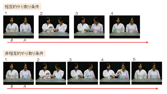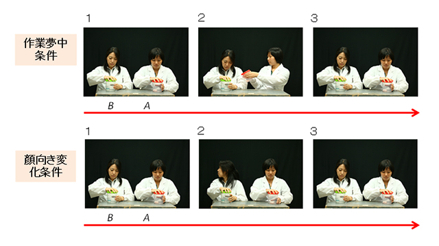 顔向き変化条件:(1)AもBも容器を開けようとする。(2)Aは一瞬手を止めるがBに援助を求めず、Bは援助を求められてはいないが一瞬手を止めて、顔を横に向ける。その後、A、Bともに作業を続ける。(3)A、Bともに作業を続ける。2人とも最終的に成功しない。