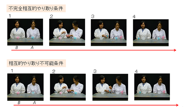 2人の人物が、サルにとって意味のない色違いのボールを3個ずつ持っています。人物Aが箱を持って、人物Bに手持ちのボールをすべて入れるよう要求します。それが終わると、今度は人物Bが同様に人物Aの手持ちのボールをお返しに要求しました。その後、研究1と同様の手続きで人物ABをサルに選択させました。研究1同様、どちらの人物から報酬を受け取っても、サルにはまったく利害はありません。実際、人物Aがお返しに3個全てを渡した場合(相互的やり取り条件)、サルの好みは特に見られませんでした。ところが、Aがボールを渡さなかった場合(非相互的やり取り条件)や1個しか渡さなかった場合(不完全相互的やり取り条件)には、サルはその人物をより多く回避しました。同様に1個しか渡さない場合でも、Aが最初からボールを1個しか持っておらず、なけなしの1個を渡す場合には(相互的やり取り不可能条件)、こうした回避は減少しました。つまりサルは、アンフェアで身勝手に振る舞う演技者を避けることがわかりました。