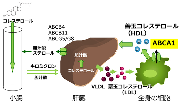 ABCA1は、血中HDLが消失する遺伝病であるタンジール病の原因遺伝子として1999年に発見され、HDL形成に必須であることが明らかにされました。ABCA1は、ATPのエネルギーを利用してさまざまな物質を輸送するABCタンパク質というトランスポーターの一種であることから、コレステロールがABCA1によって動かされ、HDLができると予想されていましたが、どのようなメカニズムでできるかはわかっていませんでした。