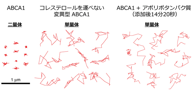 一方、HDLを産生する機能を持たない変異型ABCA1分子は二量体化せず、単量体の状態のままで細胞膜上を拡散していました(図2)。したがって、コレステロールを動かす能力のあるABCA1は、コレステロールの受け取り手であるアポリポタンパク質がやって来る前の段階では、二量体の形となって細胞膜上に静止していることがわかりました。