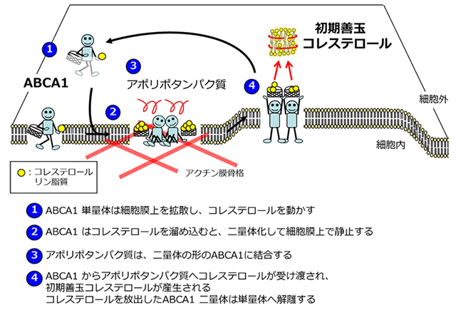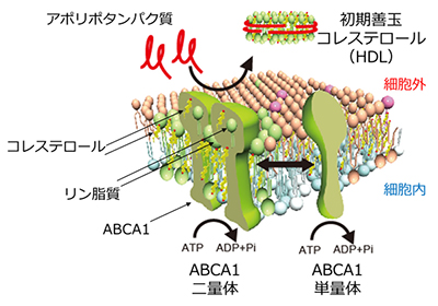 本研究グループは、ABCA1は細胞膜中のコレステロールを動かして自身の分子内に溜め込み、二量体化して、コレステロールの受け取り手であるアポリポタンパク質の接近に備えてスタンバイしているものと考えています。