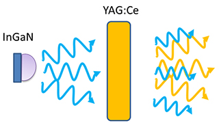 青色LEDと、青色の光を吸収して黄色の光を放出する蛍光体(主にセリウムを添加したイットリウム・アルミニウム・ガーネット結晶が使われる)から構成されます。吸収されなかった青色光と、蛍光体からの黄色光が混ざって白色光となります。