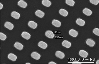 図2:ナノアンテナとしてはたらく、金属ナノ粒子の周期構造の電子顕微鏡画像